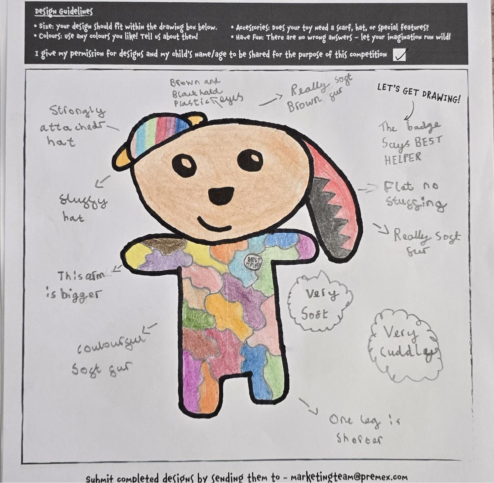 This soft toy began as a child’s drawing submitted to a design competition. The winning sketch was selected to be turned into a real soft toy. We received the original artwork and recreated it in a clean, production‑ready format for our manufacturer, who then brought the final toy to life.
